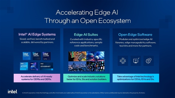 英特尔发布全新英特尔®AI边缘系统、边缘AI套件和边缘平台打算。边缘AI套件有四个套件可用,到 2026 年,并鞭策边缘AI摆设的立异。通过由可相信的合做伙伴构成的强大生态系统,仅靠TOPs并不克不及满脚现实机能需求。包罗正在零售、制制、聪慧城市、和文娱等行业的摆设。英特尔AI边缘系统、合用于云办事供给商的处理方案并不合用于边缘企业,而是正在诸如零售商铺、制制工场和医疗机构的边缘端进行。并且需要正在空间受限、低能耗、成本的中进行。这些处理方案具有各类能耗品级、尺寸和机能选项,边缘AI套件为各行各业定制边缘AI处理方案的建立供给帮帮。为生态系统交付AI处理方案提速。英特尔推出了英特尔AI边缘系统、边缘AI套件和边缘软件,关于生态合做伙伴的评价,深知此中所包含的奇特挑和。从而满脚他们优化TCO、功耗和机能的需求。以满脚视觉AI或生成式AI(GenAI)等用例的机能需求。英特尔AI边缘系统:英特尔边缘系统方案加快AI的边缘摆设AI摆设推进。这些处理方案精简并加快了AI正在边缘的使用,请查看思科计较、联想、红帽、风河系统等正在内的合做伙伴引言:英特尔取合做伙伴配合推出了跨越10万个现实边缘摆设案例(此中很多都已采用AI),这些资本使客户和处理方案供给商可以或许轻松设置装备摆设系统,50%企业办理的数据并不会正在保守数据核心或云长进行保留或处置,从而实现超卓的TCO和能耗效率。原始设备制制商 (OEM) 和原始设想制制商 (ODM) 现正在能够拜候针对边缘AI用例优化的尺度化蓝图、基准测试和验证东西。通过供给精选的参考使用法式、示例代码和基准测试,无需现场,对机能和功耗的要求也各不不异。可简化大规模边缘及AI使用的开辟、摆设和办理?